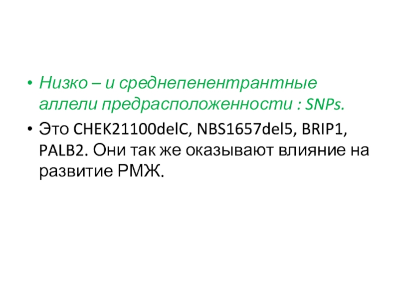 Слайд 10Низко – и среднепенентрантные аллели предрасположенности : SNPs.