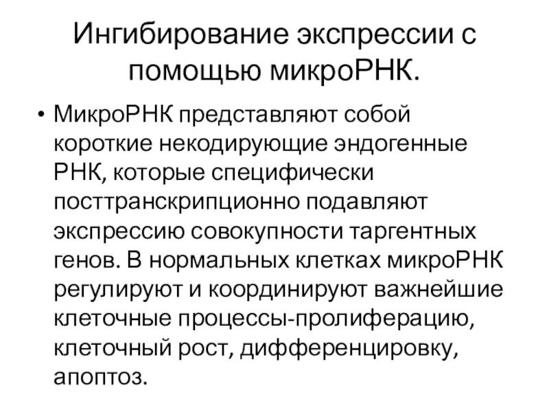 которые специфически посттранскрипционно подавляют экспрессию совокупности таргентных генов. В нормальных клетках микроРНК регулируют и координируют важнейшие клеточные процессы-пролиферацию, клеточный рост, дифференцировку, апоптоз.