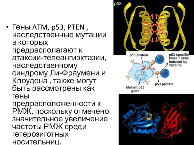 Слайд 7Гены ATM, p53, PTEN , наследственные мутации в которых предрасполагают к