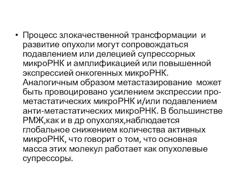 супрессорных микроРНК и амплификацией или повышенной экспрессией онкогенных микроРНК. Аналогичным образом метастазирование может быть провоцировано усилением экспрессии про-метастатических микроРНК и/или подавлением анти-метастатических микроРНК. В большинстве РМЖ,как и в др опухолях,наблюдается глобальное снижением количества активных микроРНК, что говорит о том, что основная масса этих молекул работает как опухолевые супрессоры.