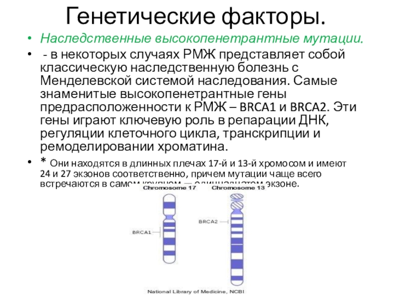 классическую наследственную болезнь с Менделевской системой наследования. Самые знаменитые высокопенетрантные гены предрасположенности к РМЖ – BRCA1 и BRCA2. Эти гены играют ключевую роль в репарации ДНК, регуляции клеточного цикла, транскрипции и ремоделировании хроматина.