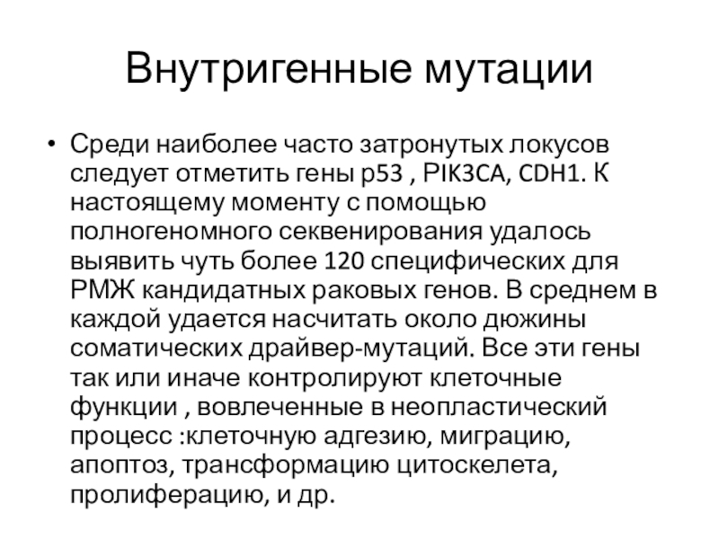 РIK3CA, CDH1. К настоящему моменту с помощью полногеномного секвенирования удалось выявить чуть более 120 специфических для РМЖ кандидатных раковых генов. В среднем в каждой удается насчитать около дюжины соматических драйвер-мутаций. Все эти гены так или иначе контролируют клеточные функции , вовлеченные в неопластический процесс :клеточную адгезию, миграцию, апоптоз, трансформацию цитоскелета, пролиферацию, и др.