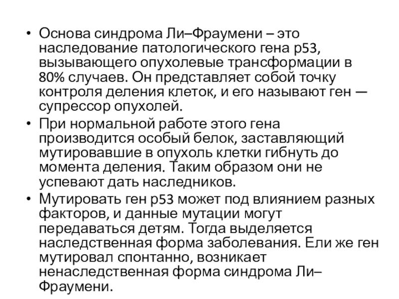 Слайд 9Основа синдрома Ли–Фраумени – это наследование патологического гена р53, вызывающего опухолевые