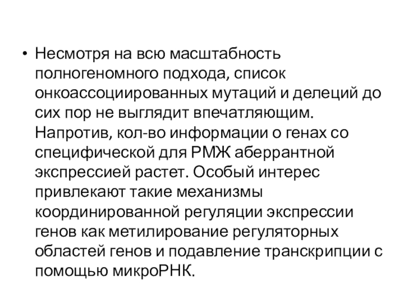 Слайд 16Несмотря на всю масштабность полногеномного подхода, список онкоассоциированных мутаций и делеций
