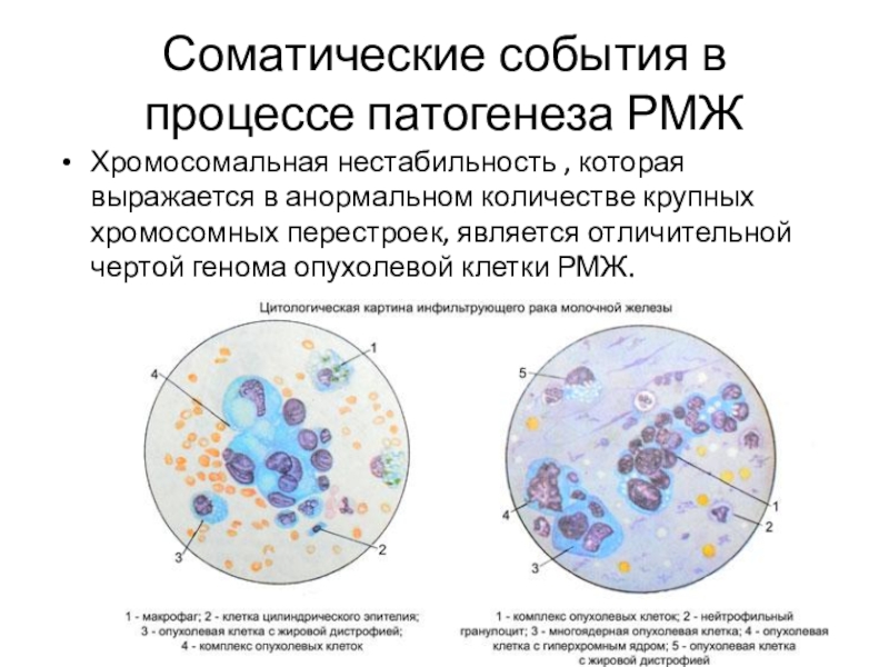 Слайд 13Соматические события в процессе патогенеза РМЖ