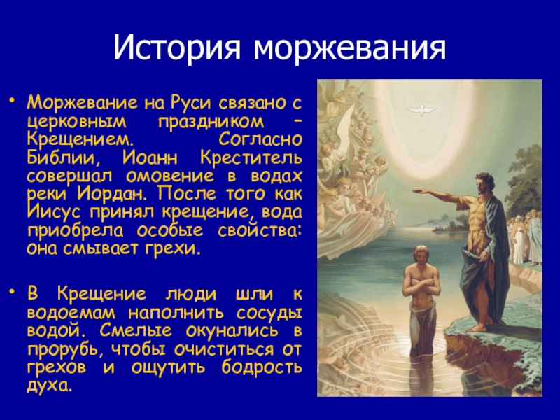История моржеванияМоржевание на Руси связано с церковным праздником – Крещением. Согласно Библии, Иоанн Креститель совершал омовение в