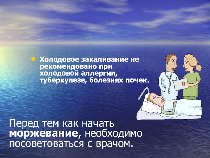 Холодовое закаливание не рекомендовано при холодовой аллергии, туберкулезе, болезнях почек. Перед тем как начать моржевание, необходимо посоветоваться