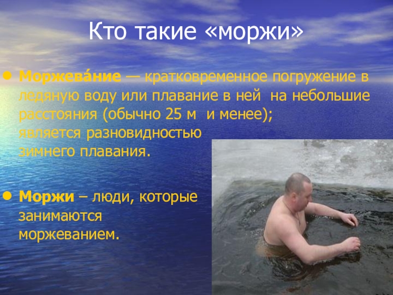 Кто такие «моржи»Моржева́ние — кратковременное погружение в ледяную воду или плавание в ней на небольшие  расстояния