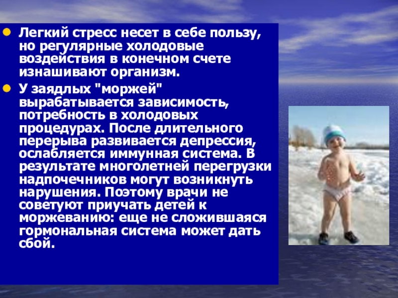 Слайд 7Легкий стресс несет в себе пользу, но регулярные холодовые воздействия в