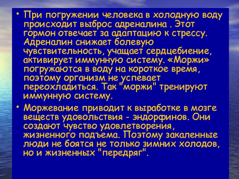 Слайд 6При погружении человека в холодную воду происходит выброс адреналина . Этот