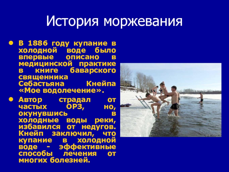 История моржеванияВ 1886 году купание в холодной воде было впервые описано в медицинской практике в книге баварского