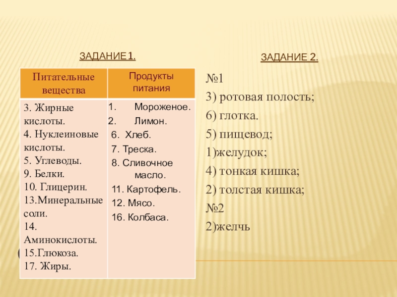 1)кишечный сок; 2)желчь; 3)печень; 4)слюна.