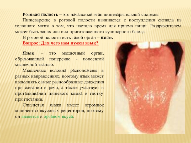 Слизистая языка имеет огромное количество вкусовых рецепторов, поэтому он является и органом вкуса.
