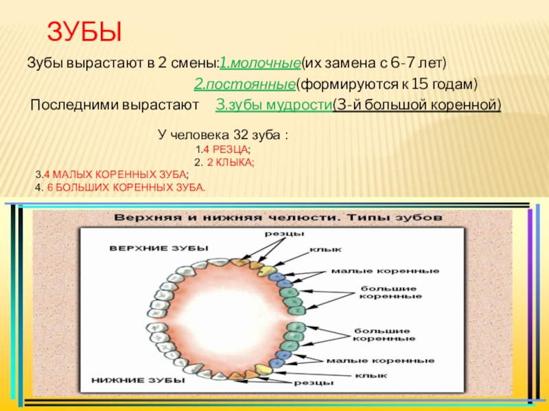 2. 2 КЛЫКА; 3.4 МАЛЫХ КОРЕННЫХ ЗУБА; 4. 6 БОЛЬШИХ КОРЕННЫХ ЗУБА.