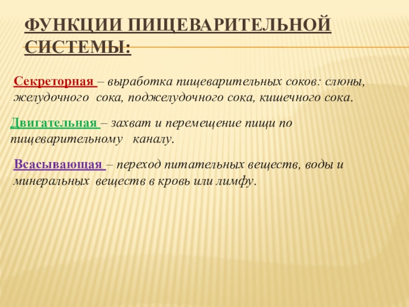Всасывающая – переход питательных веществ, воды и минеральных веществ в кровь или лимфу.