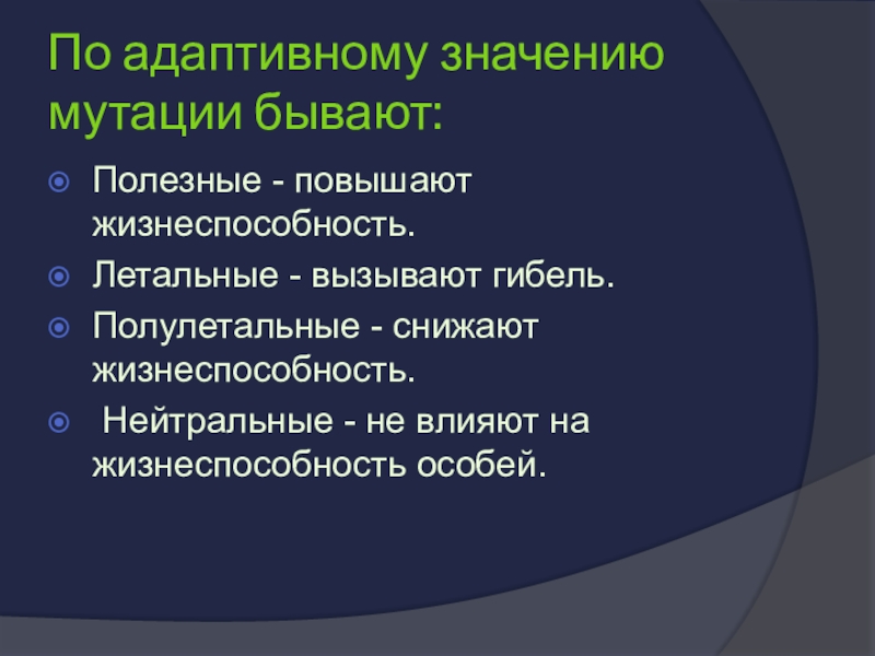 Слайд 10По адаптивному значению мутации бывают: