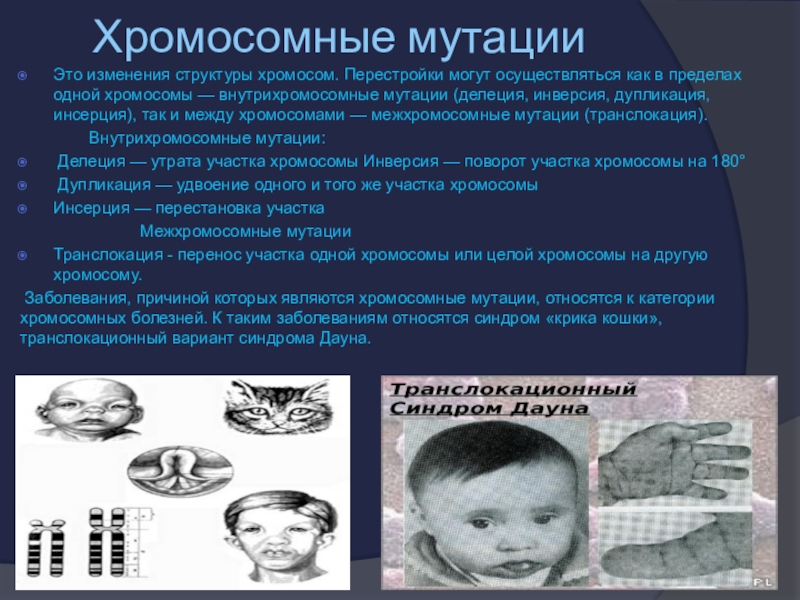 Заболевания, причиной которых являются хромосомные мутации, относятся к категории хромосомных болезней. К таким заболеваниям относятся синдром «крика кошки», транслокационный вариант синдрома Дауна.