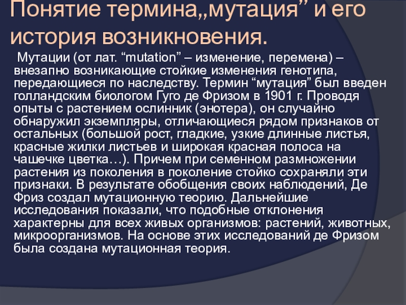 Слайд 2Понятие термина,,мутация’’ и его история возникновения.