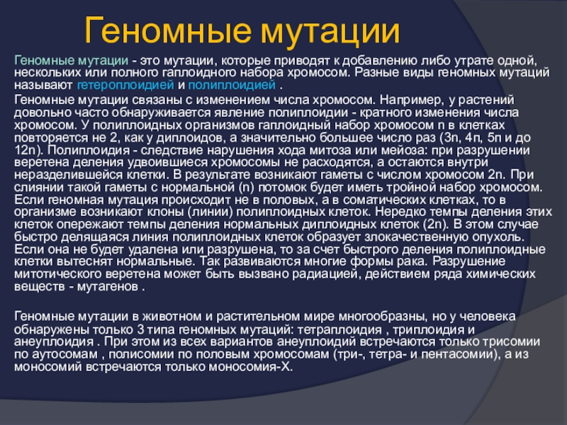 Геномные мутации в животном и растительном мире многообразны, но у человека обнаружены только 3 типа геномных мутаций: тетраплоидия , триплоидия и анеуплоидия . При этом из всех вариантов анеуплоидий встречаются только трисомии по аутосомам , полисомии по половым хромосомам (три-, тетра- и пентасомии), а из моносомий встречаются только моносомия-Х.