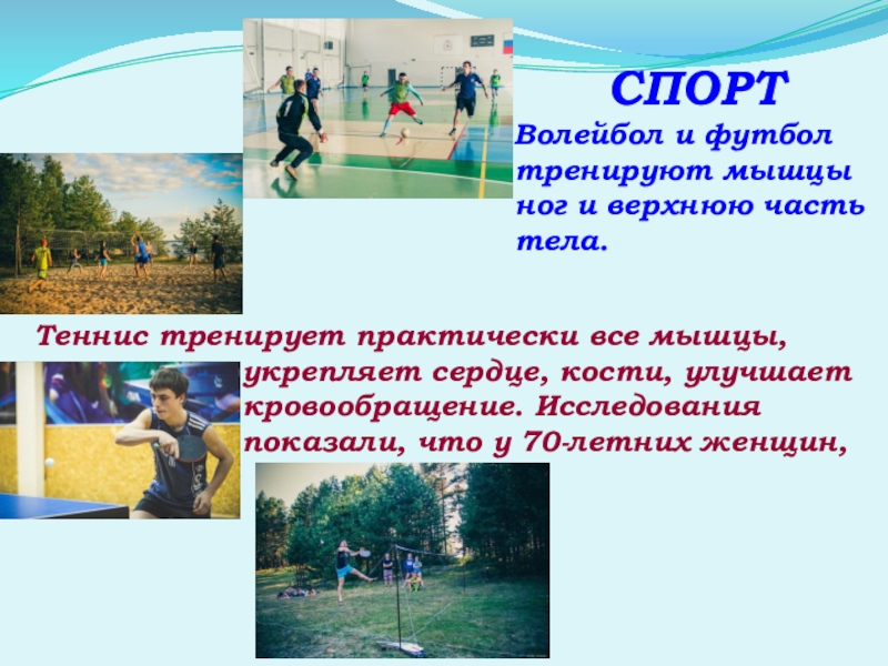 Теннис тренирует практически все мышцы, укрепляет сердце, кости, улучшает кровообращение. Исследования показали, что у 70-летних женщин,