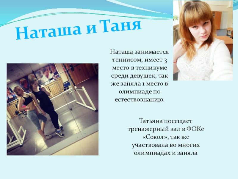 Татьяна посещает тренажерный зал в ФОКе «Сокол», так же участвовала во многих олимпиадах и заняла