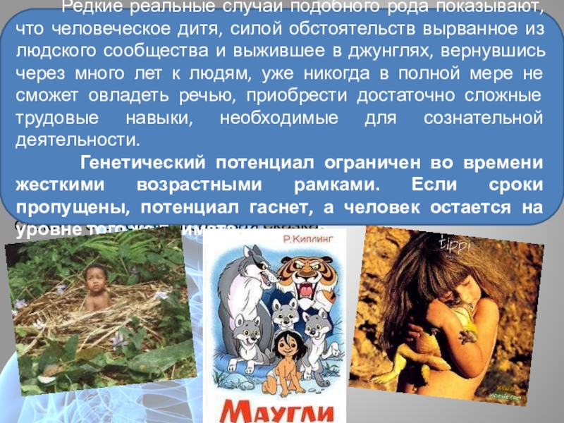 Редкие реальные случаи подобного рода показывают, что человеческое дитя, силой обстоятельств вырванное из людского сообщества и выжившее в джунглях, вернувшись через много лет к людям, уже никогда в полной мере не сможет овладеть речью, приобрести достаточно сложные трудовые навыки, необходимые для сознательной деятельности.