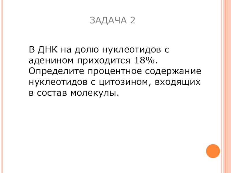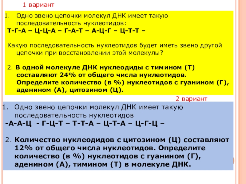 2. Количество нуклеодидов с цитозином (Ц) составляют 12% от общего числа нуклеотидов. Определите количество (в %) нуклеотидов с гуанином (Г), аденином (А), тимином (Т) в молекуле ДНК.