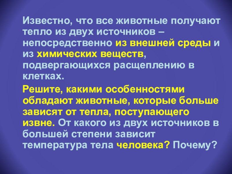 Решите, какими особенностями обладают животные, которые больше зависят от тепла, поступающего извне. От какого из двух источников в большей степени зависит температура тела человека? Почему?