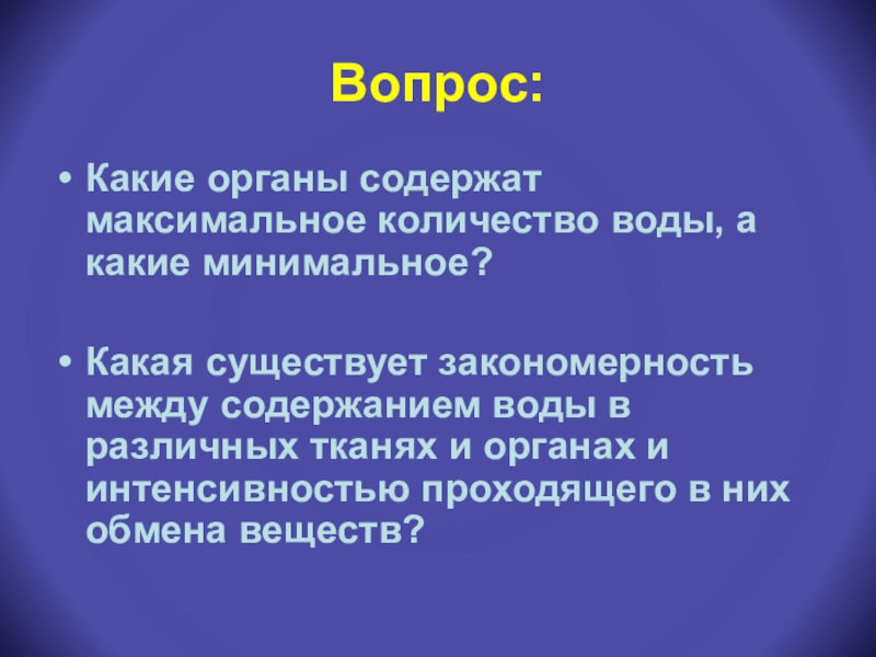 между содержанием воды в различных тканях и органах и интенсивностью проходящего в них обмена веществ?