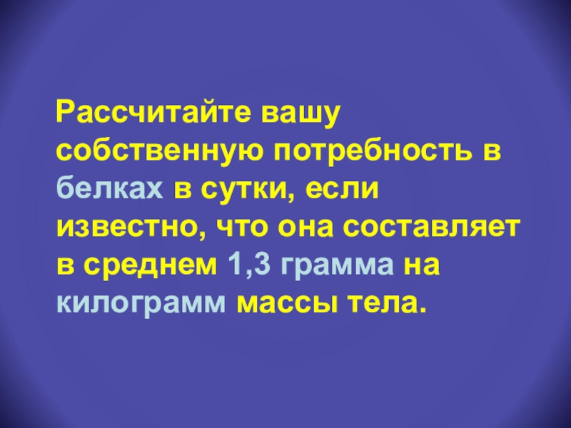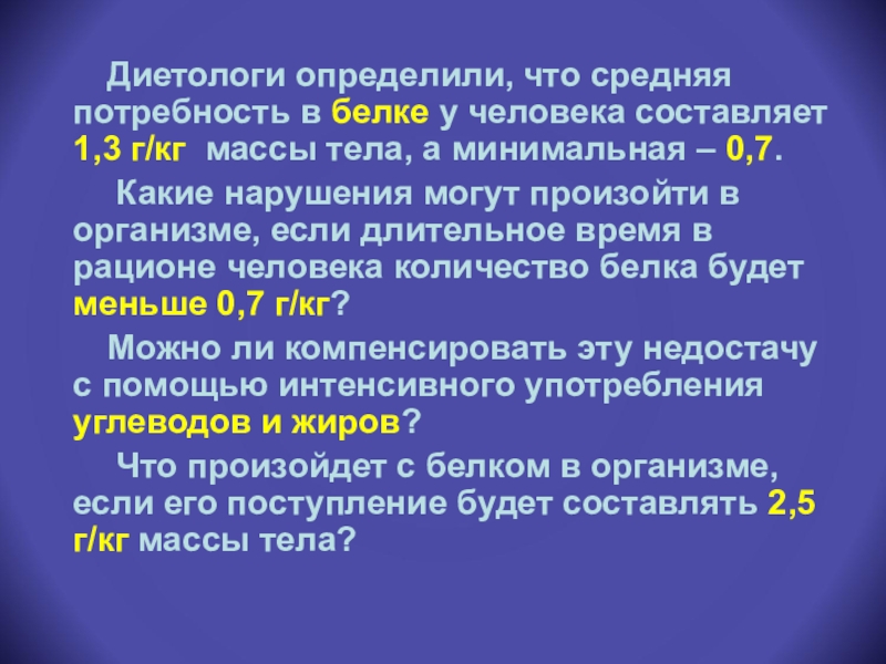 Слайд 26 Диетологи определили, что средняя потребность в белке