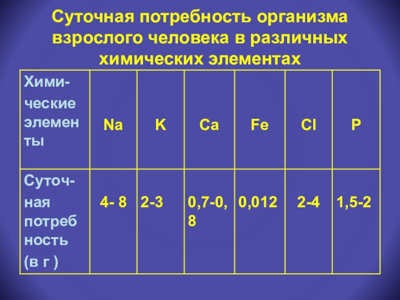 Слайд 15Суточная потребность организма взрослого человека в различных химических элементах