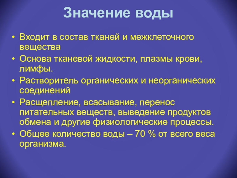 Общее количество воды – 70 % от всего веса организма.