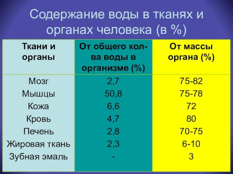 Какие органы содержат максимальное количество воды, а какие минимальное?