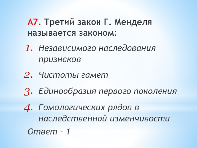 Слайд 9А7. Третий закон Г. Менделя называется законом: