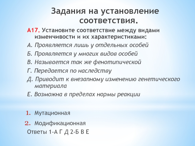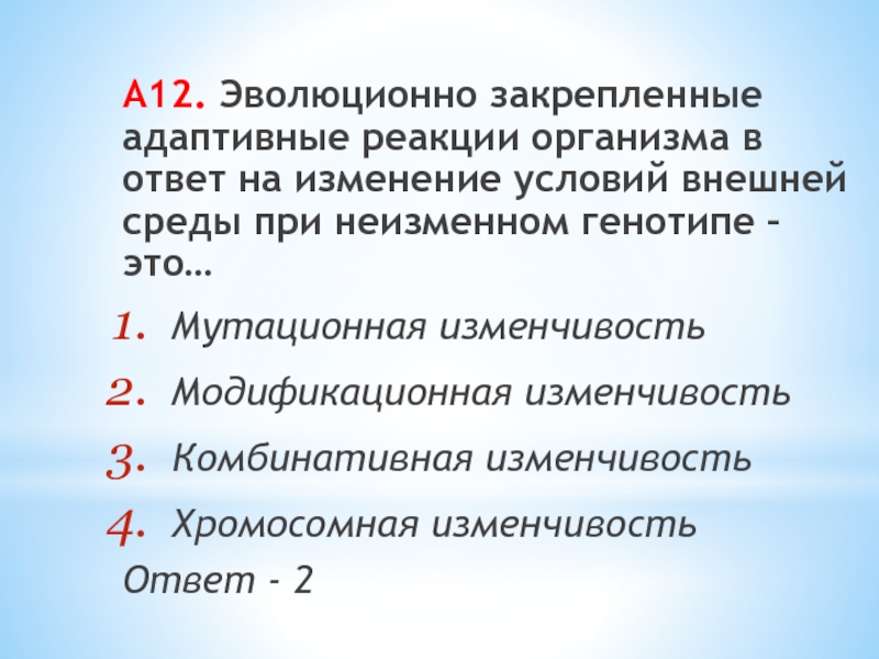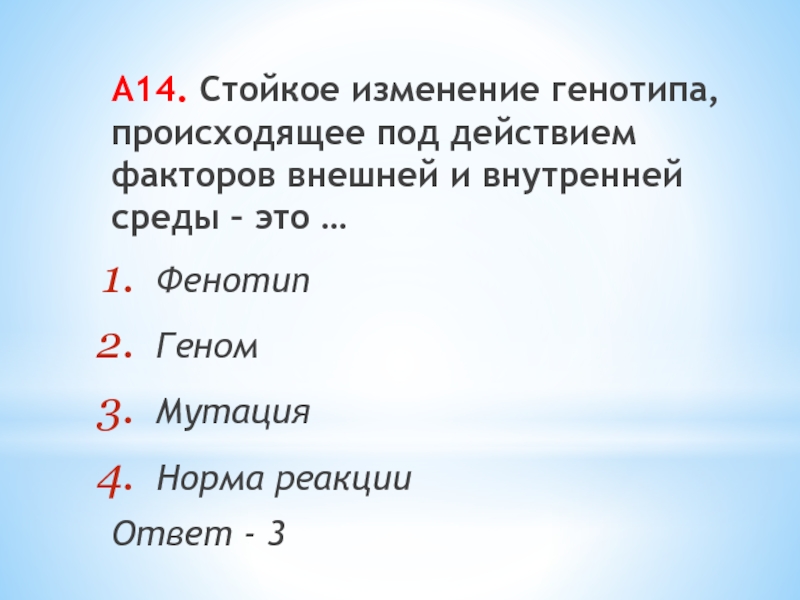 Слайд 16А14. Стойкое изменение генотипа, происходящее под действием факторов внешней и внутренней