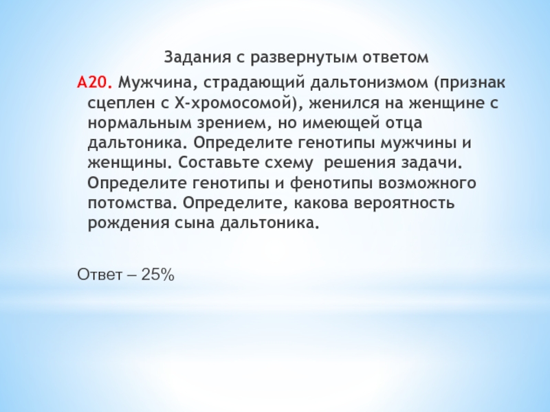 А20. Мужчина, страдающий дальтонизмом (признак сцеплен с Х-хромосомой),