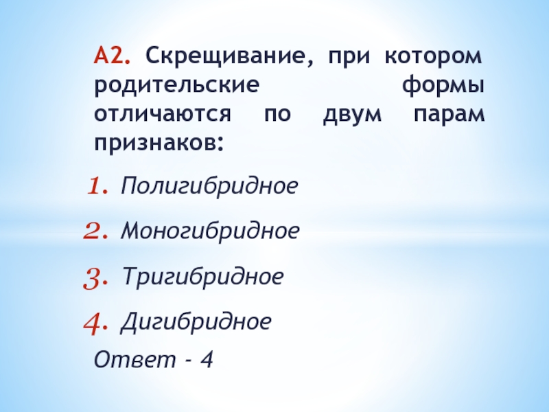 Слайд 4А2. Скрещивание, при котором родительские формы отличаются по двум парам признаков:
