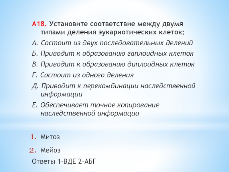 Слайд 20А18. Установите соответствие между двумя типами деления эукариотических клеток: