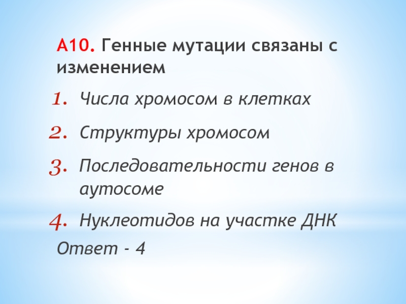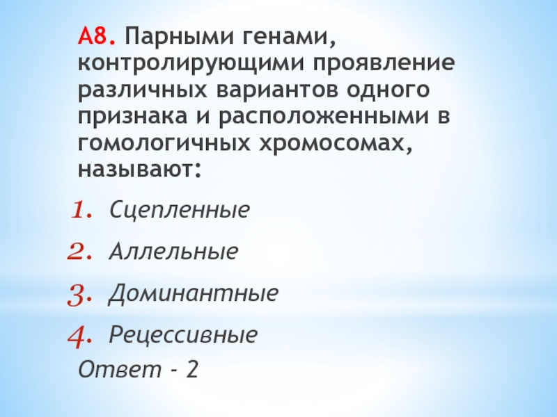 Слайд 10А8. Парными генами, контролирующими проявление различных вариантов одного признака и расположенными