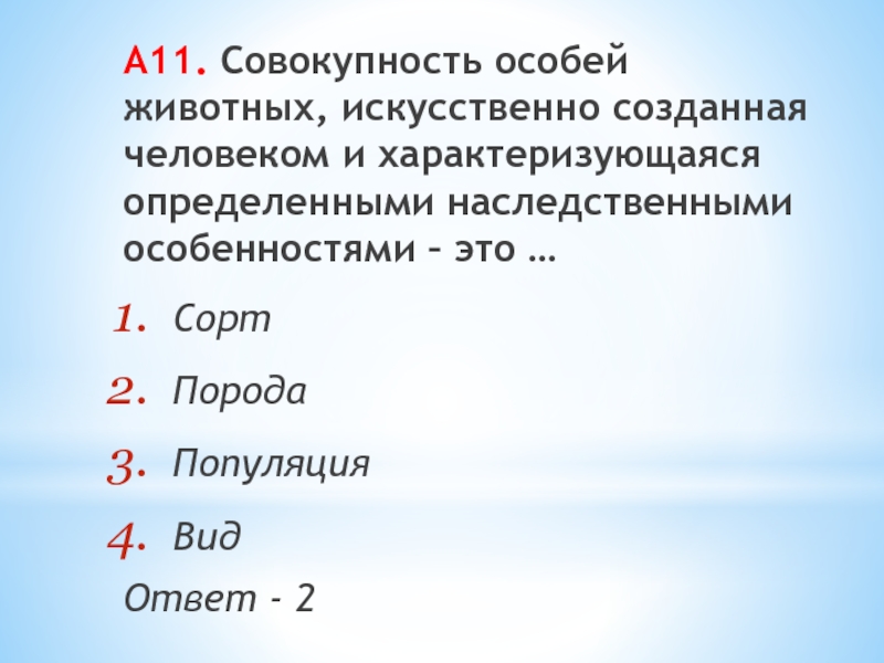 Слайд 13А11. Совокупность особей животных, искусственно созданная человеком и характеризующаяся определенными наследственными