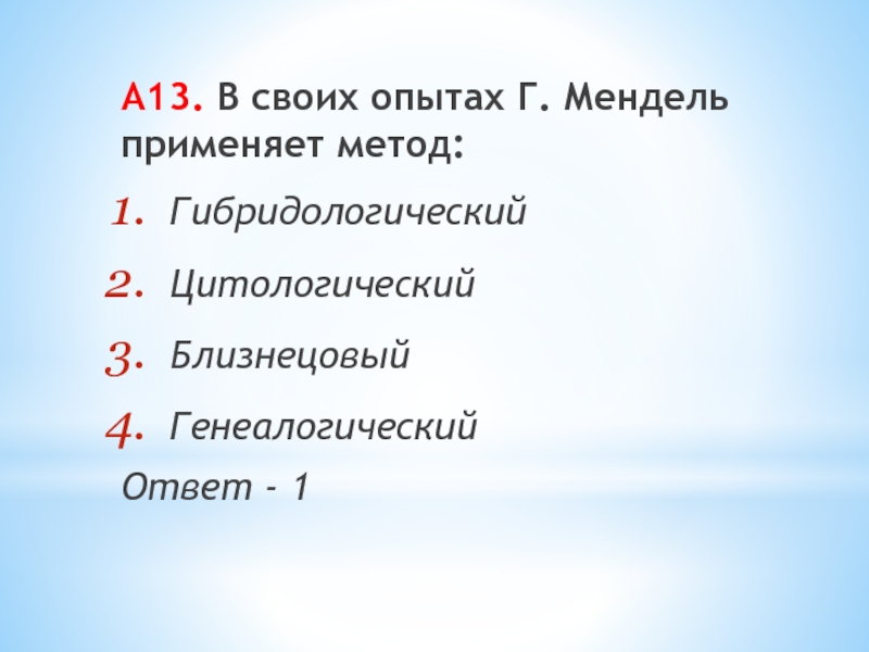 Слайд 15А13. В своих опытах Г. Мендель применяет метод: