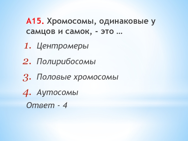 Слайд 17А15. Хромосомы, одинаковые у самцов и самок, - это …