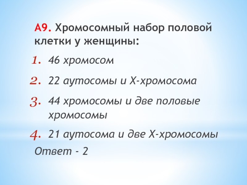 Слайд 11А9. Хромосомный набор половой клетки у женщины: