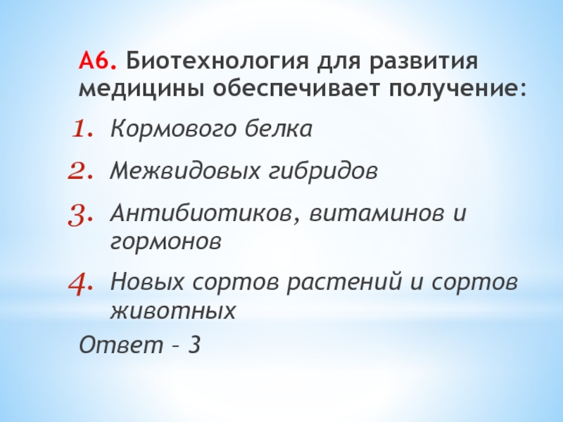Слайд 8А6. Биотехнология для развития медицины обеспечивает получение: