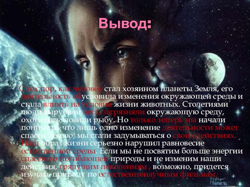 обусловила изменения окружающей среды и стала влиять на условия жизни животных. Столетиями люди вырубали леса, загрязняли окружающую среду, охотились, ловили рыбу. Но только теперь мы начали понимать, что лишь одно изменение деятельности может спасти Землю, мы стали задумываться о своих действиях. Наш образ жизни серьезно нарушил равновесие естественной среды. Если мы не посвятим больше энергии спасению погибающей природы и не изменим наши действия, грядущим поколениям , возможно, придется изучать природу по естественнонаучным фильмам.