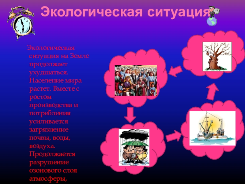 с ростом производства и потребления усиливается загрязнение почвы, воды, воздуха. Продолжается разрушение озонового слоя атмосферы, изменяется климат.