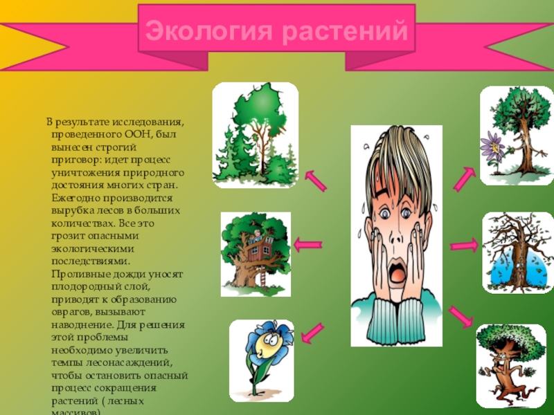 процесс уничтожения природного достояния многих стран. Ежегодно производится вырубка лесов в больших количествах. Все это грозит опасными экологическими последствиями. Проливные дожди уносят плодородный слой, приводят к образованию оврагов, вызывают наводнение. Для решения этой проблемы необходимо увеличить темпы лесонасаждений, чтобы остановить опасный процесс сокращения растений ( лесных массивов).