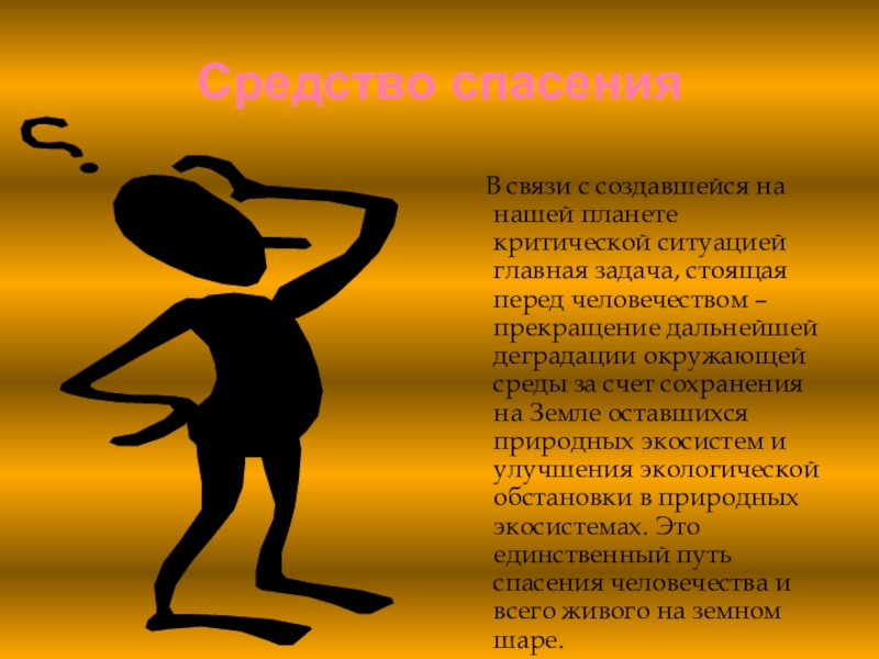 задача, стоящая перед человечеством – прекращение дальнейшей деградации окружающей среды за счет сохранения на Земле оставшихся природных экосистем и улучшения экологической обстановки в природных экосистемах. Это единственный путь спасения человечества и всего живого на земном шаре.
