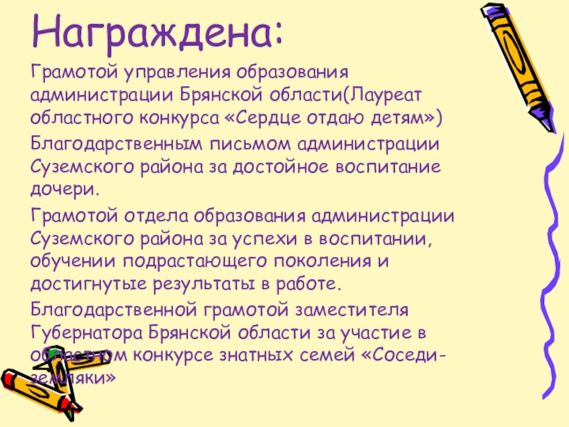 Грамотой управления образования администрации Брянской области(Лауреат областного конкурса «Сердце отдаю детям»)