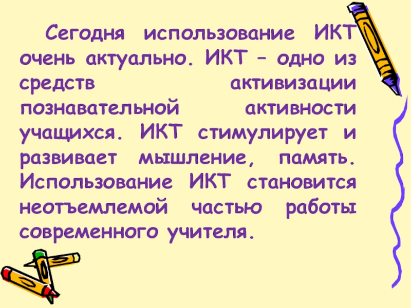 познавательной активности учащихся. ИКТ стимулирует и развивает мышление, память. Использование ИКТ становится неотъемлемой частью работы современного учителя.
